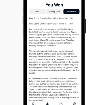 After your game ends, GoTeam App’s AI-powered game recap automatically generates a clear, easy-to-read summary of how the game unfolded. From key moments and scoring runs to standout player performances and final stats, the recap captures everything that mattered—without anyone needing to write a single word.